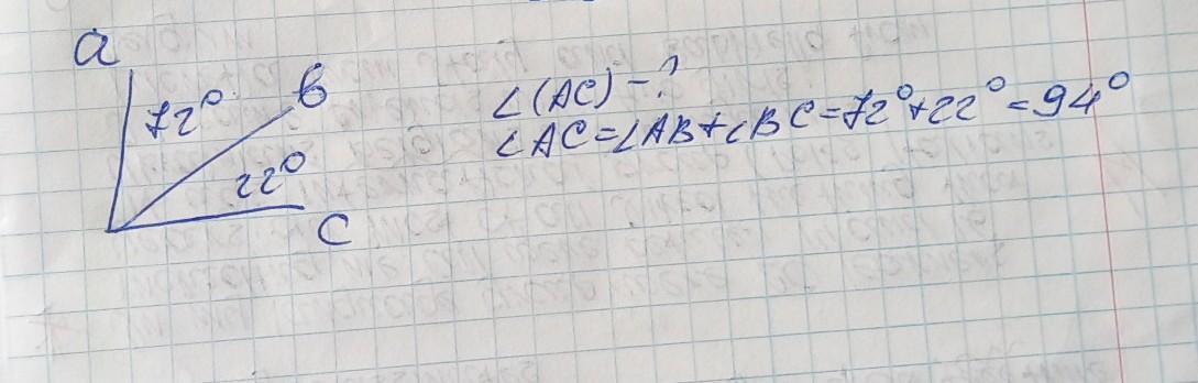 Промінь b проходить між проміннями a і c.Знайдіть кут (ac),якщо кут (ab)=72°,кут (bc)=22°