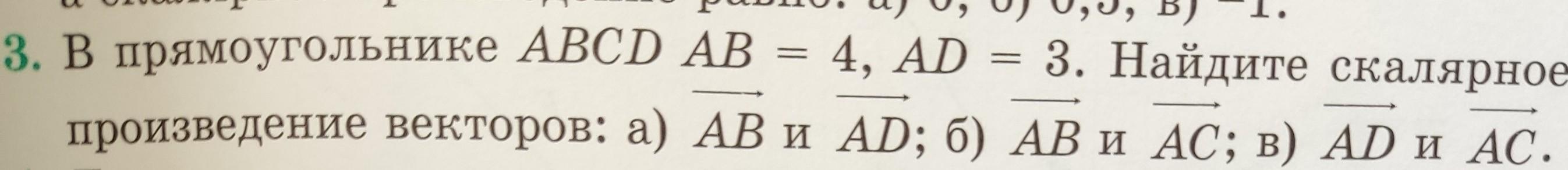 В прямоугольнике АВСD АВ=4, АD=3. Найдите скалярное произведение векторов: а)АВ и AD; б) АВ и АС; в)AD и АС срооооочноооо пж