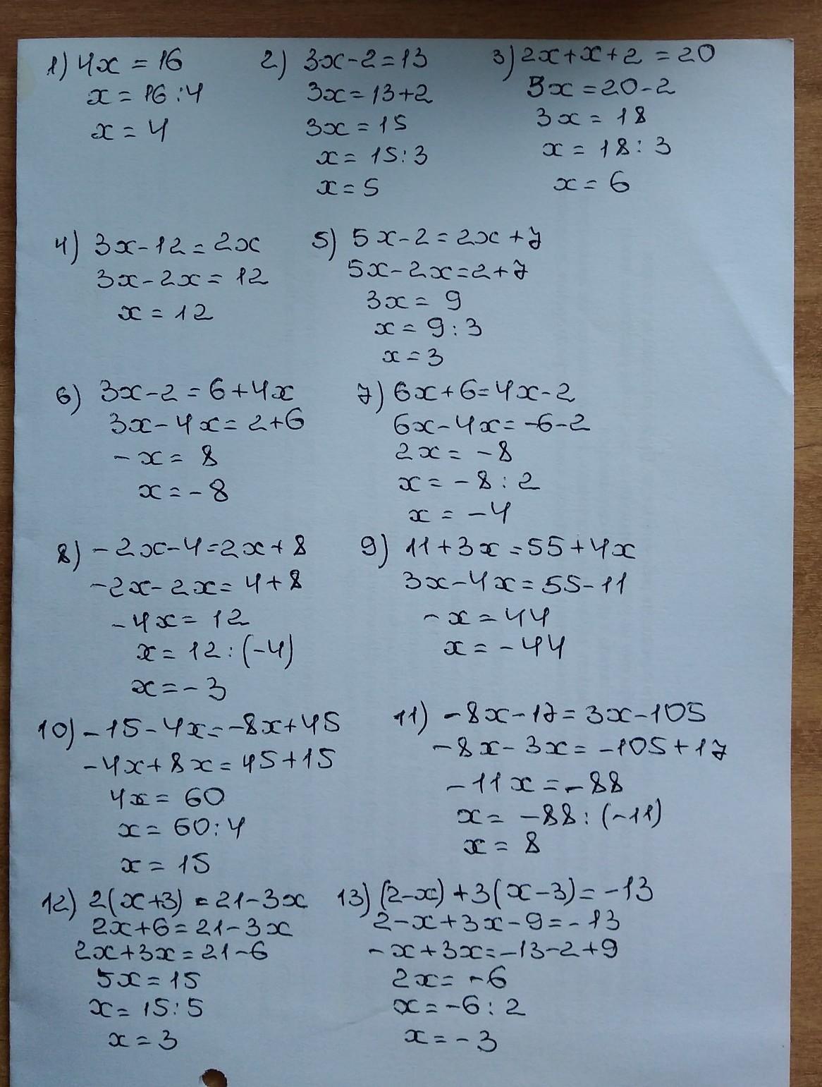 Решить уравнения: 1) 4х = 16 2) 3х – 2 = 13 3) 2х + х + 2 = 20 4) 3х – 12 = 2х 5) 5х – 2 = 2х + 7 6) 3х – 2 = 6 + 4х 7) 6х + 6 = 4х – 2 8) – 2х – 4 = 2х + 8 9) 11 + 3х = 55 + 4х 10) – 15 – 4х = - 8х + 45 11) – 8х – 17 = 3х - 105 12) 2(х + 3) = 21 – 3х 13) (2 – х) + 3(х – 3) = - 13 14) – 3(1 – 3х) – 12 = 12