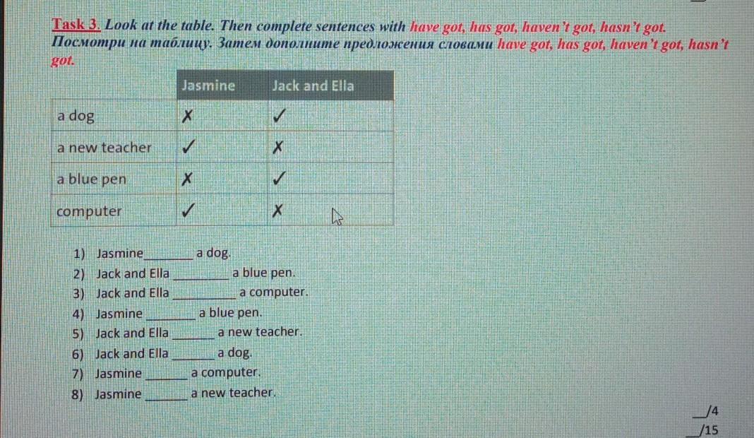 Task 3. Look at the table. Then complete sentences with have got, has gor, haven't got, hasn' got. Посмотри на таблицу. Затем дополните предложения словами hаvе gоt, has got, haven't got, hаѕn't got