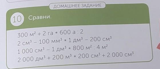 10) Сравни. 300 м2 + 2 га * 600 а: 2 2 см3 – 100 мм3 + 1 дм3 - 200 см3 1 000 см3 – 1 дм3 x 800 м2 : 4 м2 2 000 дм3 + 200 м3 * 200 см3 + 2 000 см3