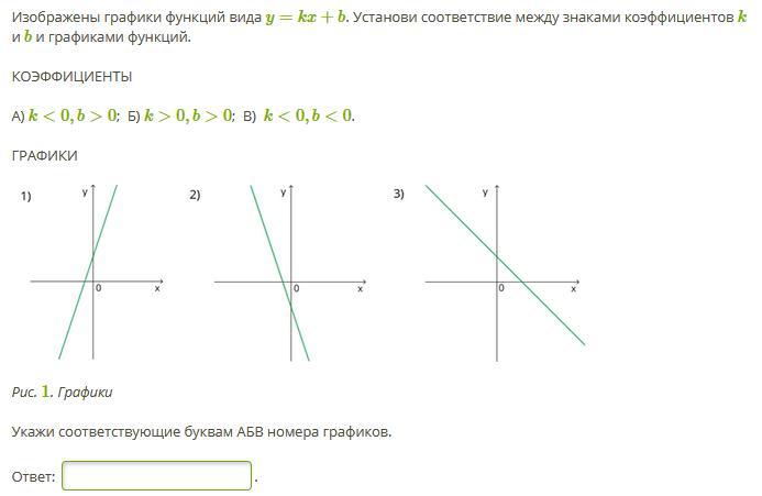 Изображены графики функций вида y=kx+b. Установи соответствие между знаками коэффициентов k и b и графиками функций.