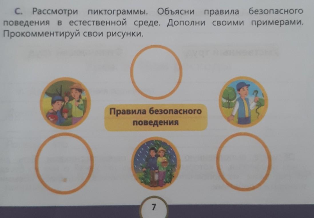 С. Рассмотри пиктограммы. Объясни правила безопасного поведения в естественной среде. Дополни своими примерами. Прoкoммeнтируй свои рисунки. Правила безопасного поведения О 7