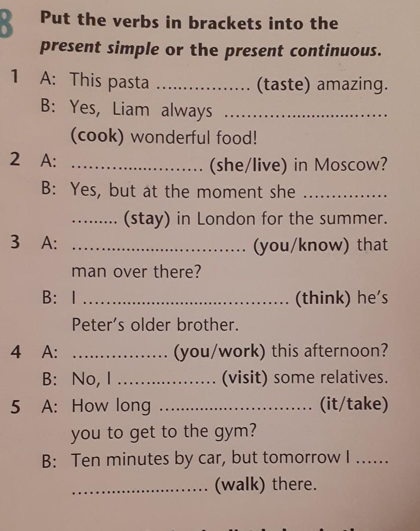 tastes, cooks, does she live in.., is staying, do you know.., think, do you work, visiting, it takes,