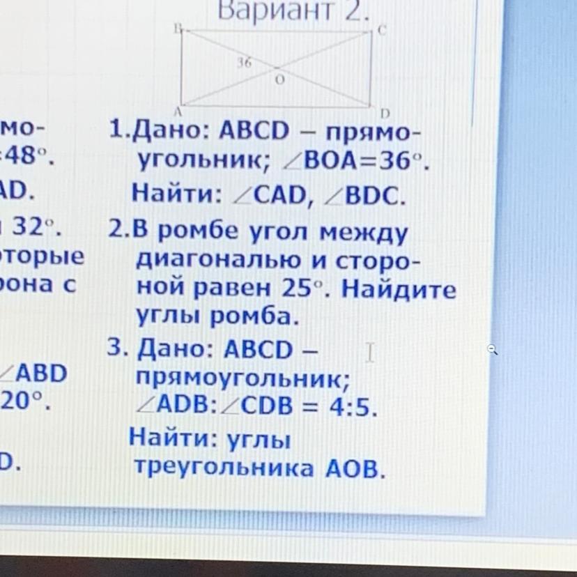 1)Ну тут если <ВОА=36⁰. Мы знаем что внутренние углы равны к 360⁰. BD,АD диагонали этого прямоугольника. Тут <BOA,<COD вертикальные углы. Значит <COD 36⁰. И тут мы видим смежные углы(не знаю как по русский будет на казахском будет сыбайлас бұрыштар. ) сумма этих углов равно к 180⁰. 180⁰-36⁰=144⁰. Тогда <CAD,<BDC равны к 144⁰