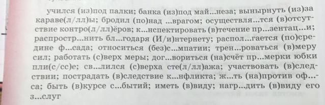 Учился из под палки; банка из под майонеза; вынырнуть из-за каравеллы;бродил над оврагом; осуществляется в отсутствие контролёров; конспектировать втечение презентации;распространить благодаря Интернету; располагается посредине фасада; относиться без симпатии; тренироваться в меру сил, работать сверх меры; договориться насчёт примерки юбки плиссе; свалился с верха стеллажа;участвовать в следствии; пострадать вследствие конфликта; жить напротив офиса; быть в курсе событий; иметь ввиду;наградить в виду его заслуг.