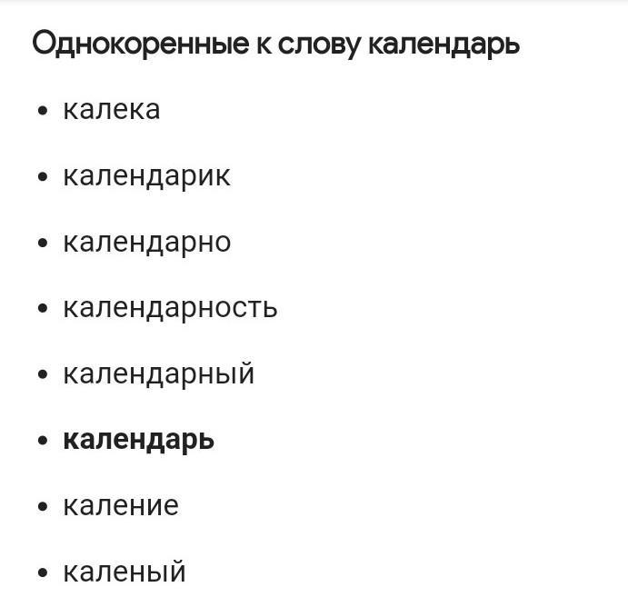 Родственные для «календарь» слова — это лексемы, близкие по смыслу, с корнем –календарь–, принадлежащие к разным частям речи. календарь — существительное, корень слова — календарь, имеет следующие однокоренные слова: