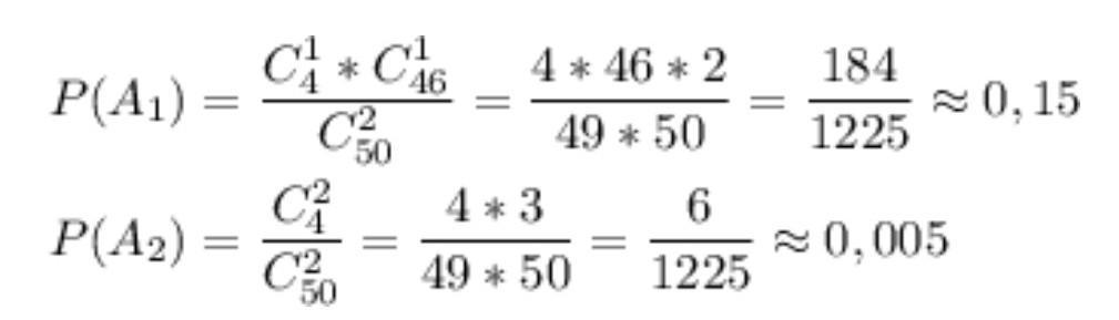 Серед 50 лотерейних білетів 4 виграшних. Знайдіть ймовірність того, що серед узятих випадковим чином трьох білетів два виграшні.