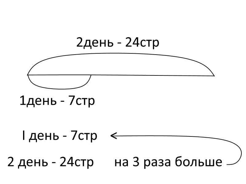 В первый день Костя прочитал 8 страниц . Во второй день 24 страницы что в три раза больше чем в первый. схема к задаче