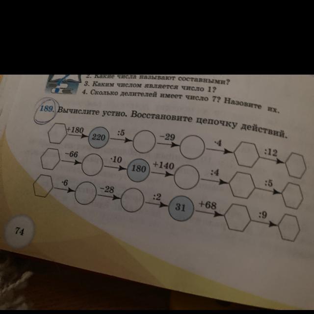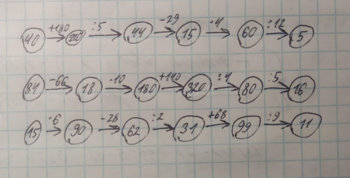 У нас даётся одно число из цепочки, двигаемся вправо - выполняем действия над стрелочками, например 220 : 5 =44, потом действие "-29" и так далее.