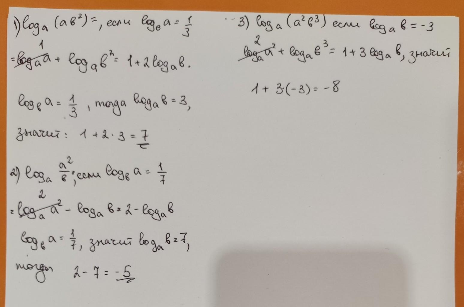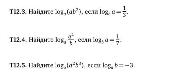 тупо подставляйте в формулы. смотрим первый логарифм: разделим его. получим loga по основанию а + logb по основанию а. первый равен 1, второй поменяем местами значение с основанием. это будет равно 1/loga по основанию b =1+1:1/3=1+3=4