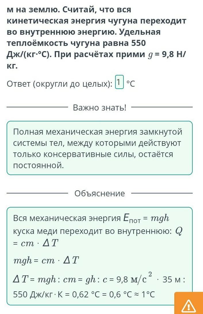 Определи, на сколько градусов нагреется кусок чугуна, если он упадёт с высоты 35 м на землю. Считай, что вся кинетическая энергия чугуна переходит во внутреннюю энергию. Удельная теплоёмкость чугуна равна 550 Дж/(кг·°С). При расчётах прими g = 9,8 Н/кг.