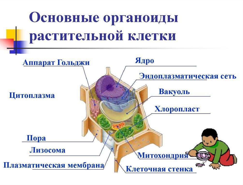 - Клеточная стенка, хлоропласт, вакуоль, ядро, аппарат Гольджи, лизосома, рибосома, цитоплазма, ядрышко, эндоплазматическая сеть, цитоплазматическая мембрана.