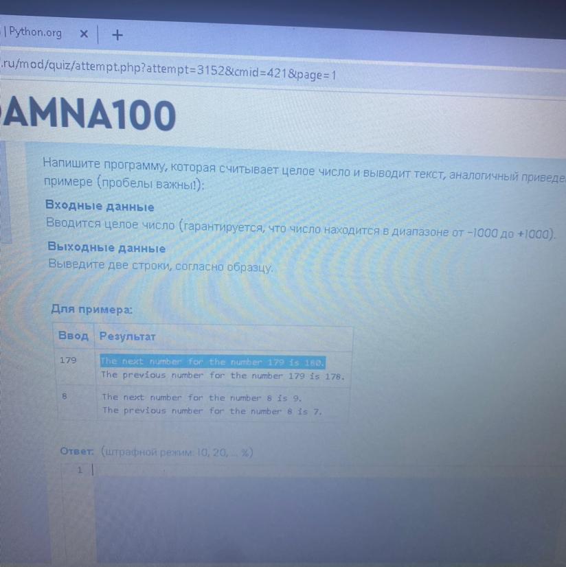 print('The previous number for the number ', n, ' is ', n-1,'.',sep='')