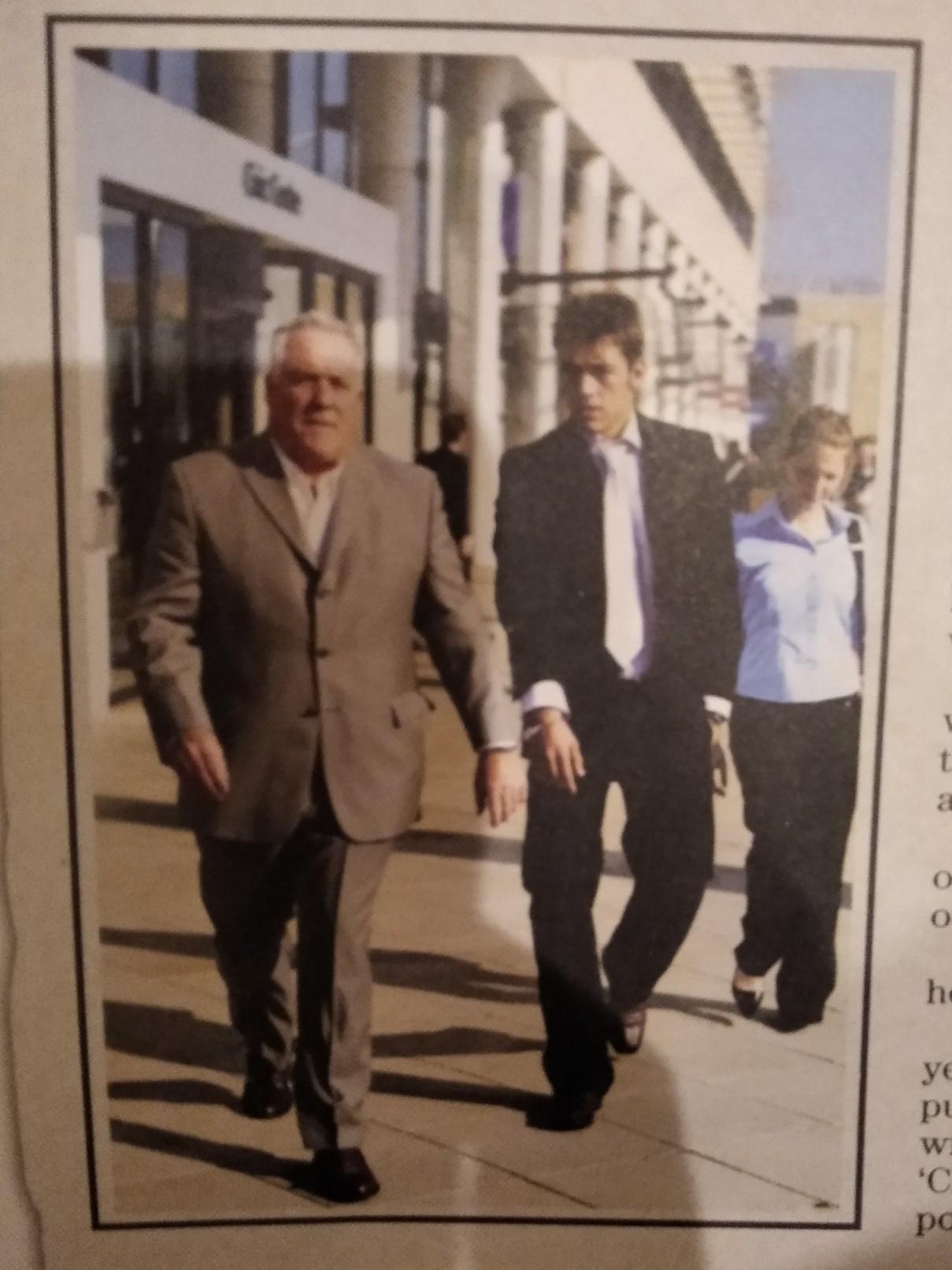 3 people will get out of their job. The men are dressed in tuxedos, one in brown, the other in black. A woman wearing a blue shirt and black trousers walks slightly behind the men.