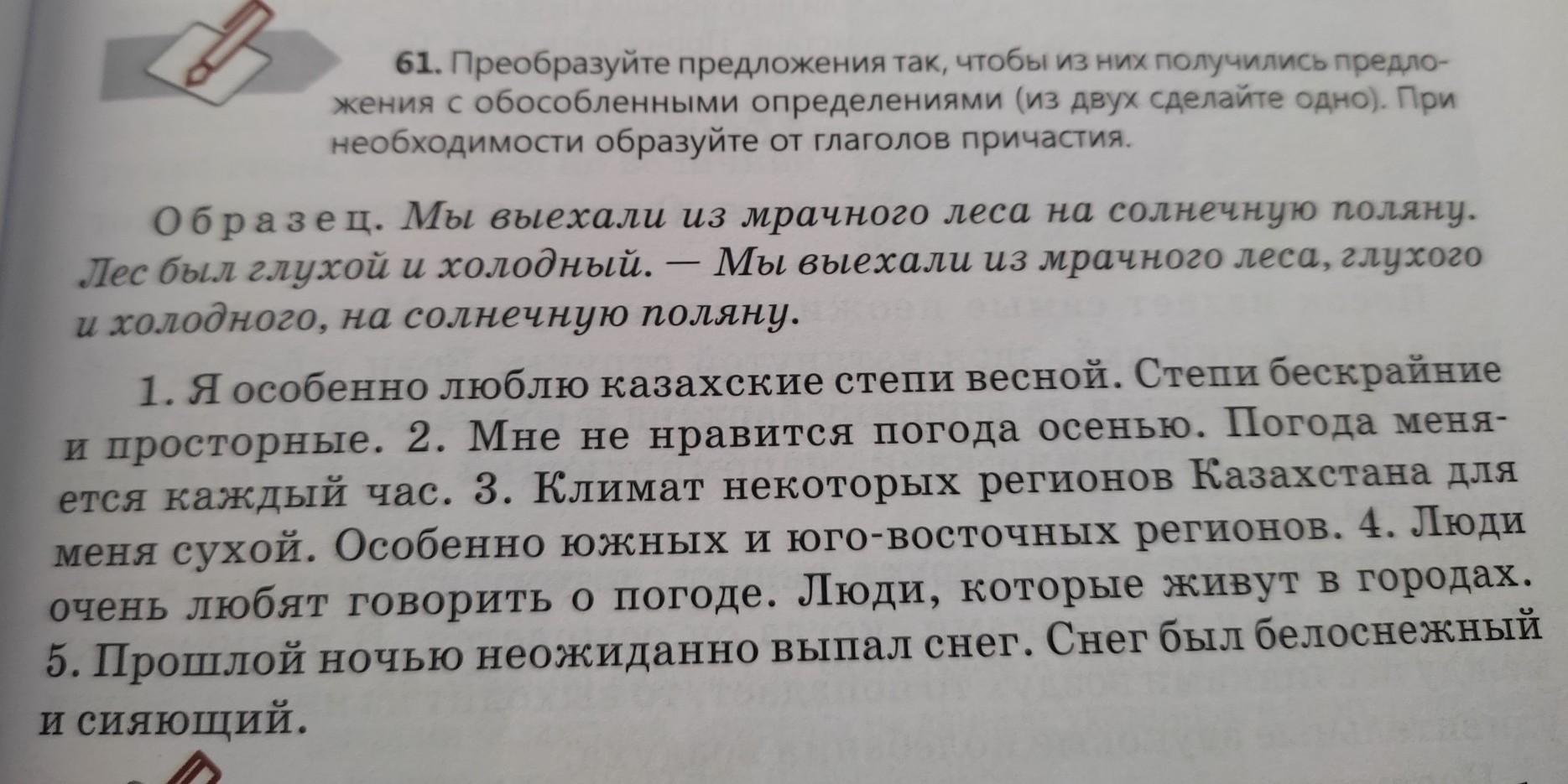 Я особенно люблю казахские, просторные, бескрайние степи весной. Мне не нравится погода осенью, меняющаяся каждый час. Климат некоторых регионов Казахстана, южных и юго-восточных, для меня сухой. Люди, живущие в городах, очень любят говорить о погоде. Прошлой ночью неожиданно выпал снег, белоснежный и сияющий.