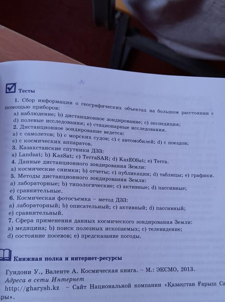 Сбор информации о географических объектах на большом помощью приборов: a) наблюдение; b) дистанционное зондирование; с) экспедиция: d) полевые исследования; е) стационарные исследования. 2. Дистанционное зондирование расстоянии с ведется: a) с самолетов; b) с морских судов; с) с автомобилей: d) с поездов: е) с космических аппаратов. 3. Казахстанские спутники ДЗЗ: a) Landsat; b) KazSat; c) TerraSAR; d) KazEOSat; e) 4. Данные дистанционного зондирования Земли: 3) космические снимки; b) отчеты; с) публикации; 5. Методы дистанционного зондирования Земли: а) лабораторные; b) типологические; с) активные; е) сравнительные. 6. Космическая фотосъемка - метод ДЗЗ: Terra. d) таблицы; е) графики. d) пассивные; а) лабораторный; b) описательный; с) активный; d) пассивный; е) сравнительный. 7. Сфера применения данных космического зондирования Земли: a) медицина; b) поиск полезных ископаемых: с) телевидение; d) состояние посевов; е) предсказание погоды.