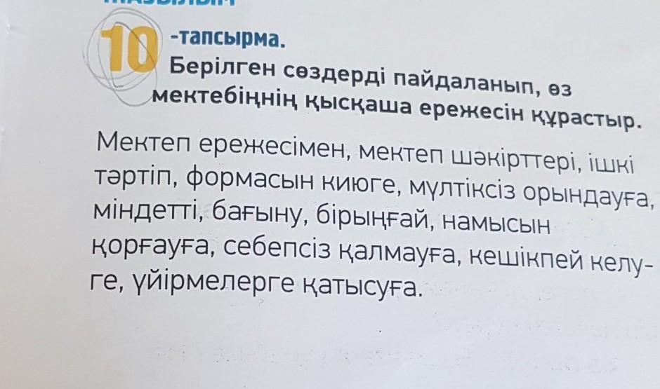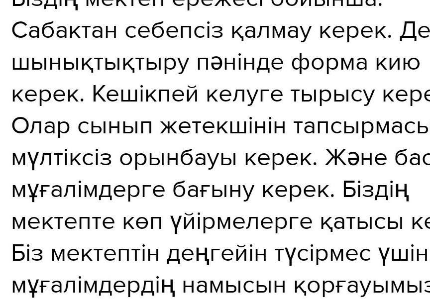 Біздің мектеп ережесі бойынша. Сабактан себепсіз қалмау керек. Дене шынықтықтыру пәнінде форма кию керек. Кешікпей келуге тырысу керек. Олар сынып жетекшінін тапсырмасын мүлтіксіз орынбауы керек. Және басқа мұғалімдерге бағыну керек. Біздің мектепте көп үйірмелерге қатысы керек. Біз мектептін деңгейін түсірмес үшін мұғалімдердің намысын қорғауымыз керек.