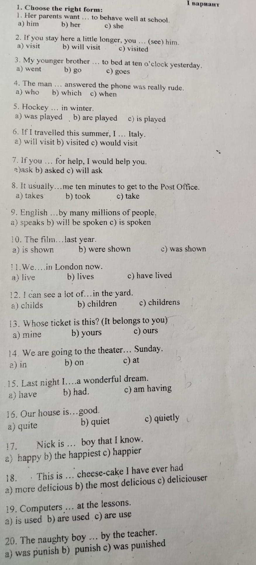 1. Choose the right form: 1. Her parents want ... to behave well at school. a) him b) her c) she 2. If you stay here a little longer, you (see) him. a) visit b) will visit c) visited 3. My younger brother ... to bed at ten o'clock yesterday. a) went b) go c) goes 4. The man ... answered the phone was really rude. a) who b) which c) when 5. Hockey ... in winter. a) was played b) are played c) is played 6. If I travelled this summer, I... Italy. a) will visit b) visited c) would visit 7. If you ... for help, I would help you. elask b) asked c) will ask 8. It usually...me ten minutes to get to the Post Office. a) takes b) took c) take 9. English ... by many millions of people. a) speaks b) will be spoken c) is spoken 10. The film... last year. a) is shown b) were shown c) was shown 11. We....in London now. a) live b) lives c) have lived 12. I can see a lot of... in the yard. b) children c) childrens