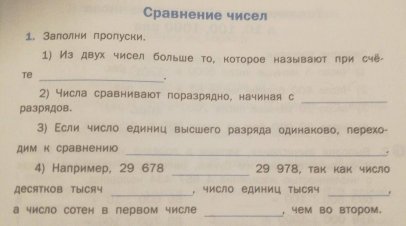 4) Например, 29 678________ 29 978, так как число десятков тысяч ___________, число единиц тысяч _______, а число сотен в первом числе __________, чем во втором.