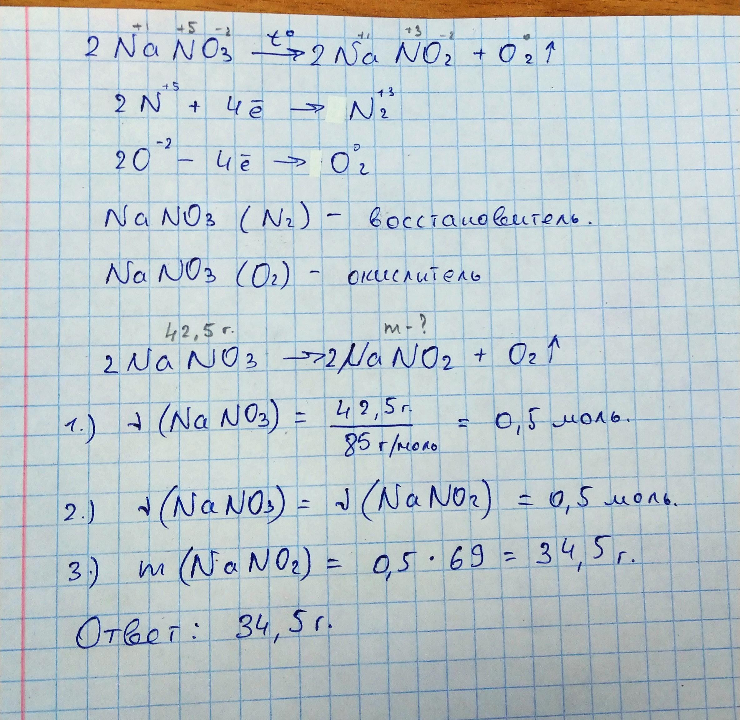 нитрат натрия разлагается при нагревании с образованием нитрита натрия (NaNO2) и кислорода .Методом электронного баланса расставить коэффициенты в уравнении данной реакции и рассчитать массу нитрита натрия ,которой образуется при разложении нитрата натрия массой 42,5 г
