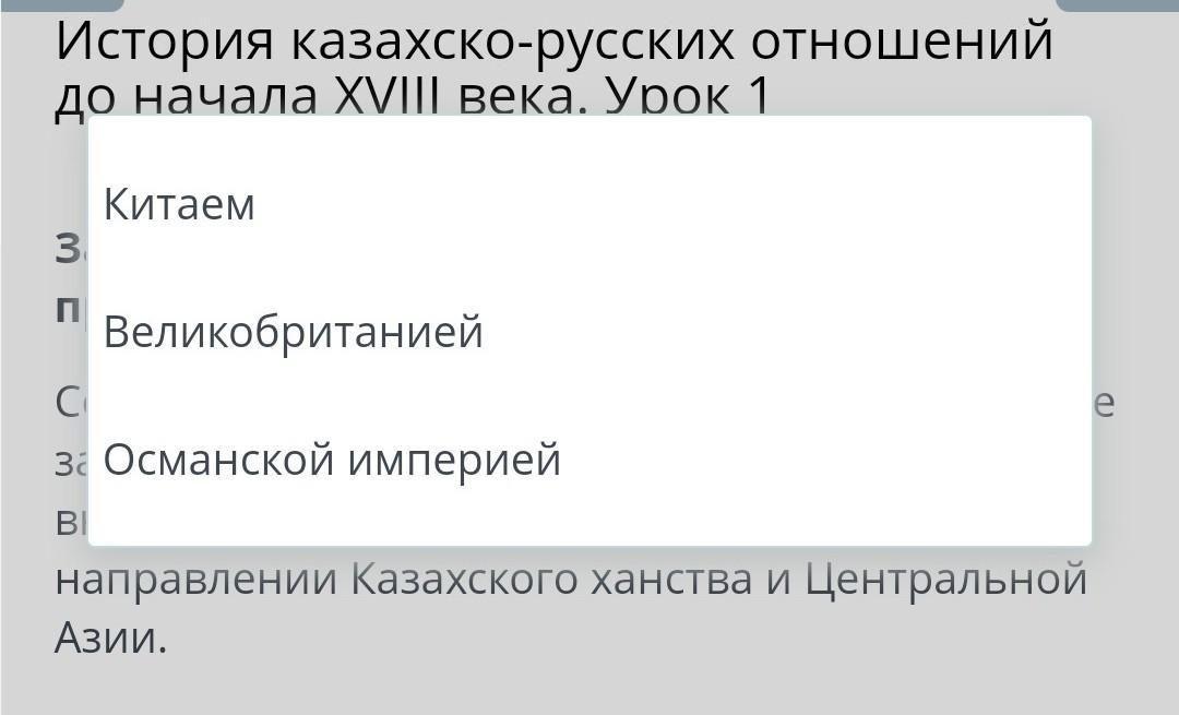 Соперничество с (СЛОВО КОТОРОЕ НУЖНО ПОДСТАВИТЬ)также заставляло Россию активизировать свою внешнеполитическую деятельность в направлении Казахского ханства и Центральной Азии.