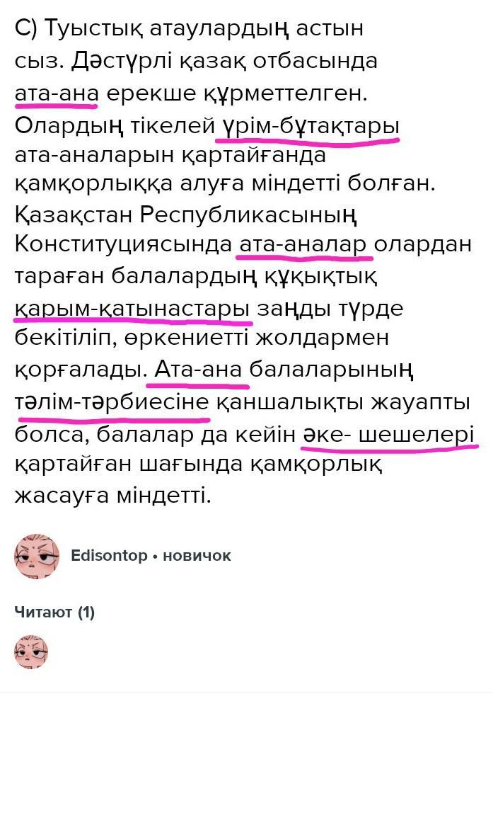 C) Туыстық атаулардың астын сыз. Дәстүрлі қазақ отбасында ата-ана ерекше құрметтелген. Олардың тікелей үрім-бұтақтары ата-аналарын қартайғанда қамқорлыққа алуға міндетті болған. Қазақстан Республикасының Конституциясында ата-аналар олардан тараған балалардың құқықтық қарым-қатынастары заңды түрде бекітіліп, өркениетті жолдармен қорғалады. Ата-ана балаларының тәлім-тәрбиесіне қаншалықты жауапты болса, балалар да кейін әке- шешелері қартайған шағында қамқорлық жасауға міндетті.
