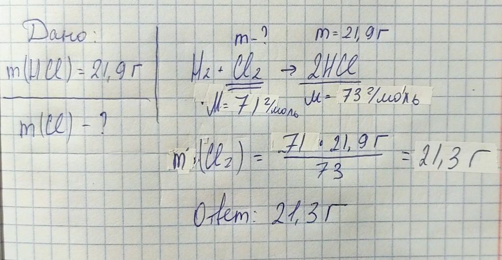 х=21,9*2*35,5/(2*36,5)=21,3г необходима хлора для получения хлороводорода по усл.задачи.