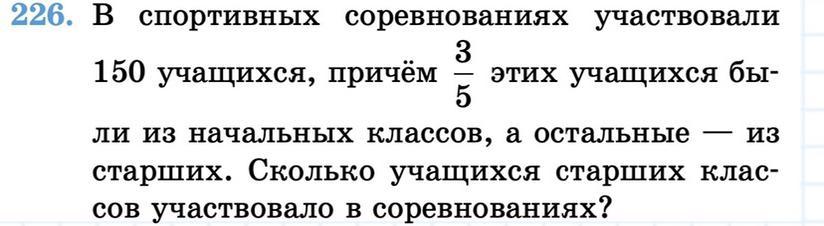 мы знаем что у нас есть 150 участников, 3/5 из них это младшие классы, для того чтобы узнать их количество нам нужно 150/5 и умножить на 3 (В итоге получаем пример 150/5×3) это получается 90, далее нужно от 150(Общее количество) отнять 90 (Младшие классы), получаем 60 участников