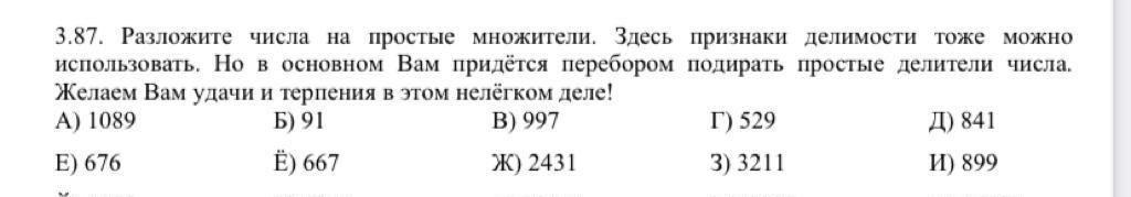 3.87. Разложите числа на простые множители. Здесь признаки делимости тоже можно использовать. Но в основном Вам придётся перебором подирать простые делители числа Желаем Вам удачи и терпения в этом нелёгком деле! A) 1089 Б) 91 B) 997 г) 529 Д) 841 E) 676 Ё) 667 Ж) 2431 3) 3211 И) 899