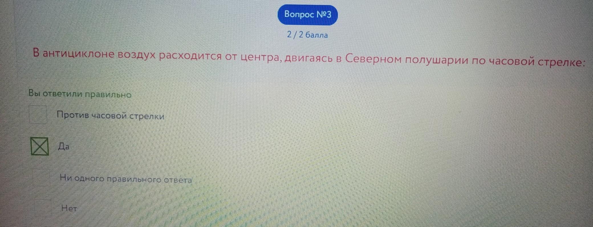 В антициклоне воздух расходится от центра, двигаясь в Северном полушарии по часовой стрелке: