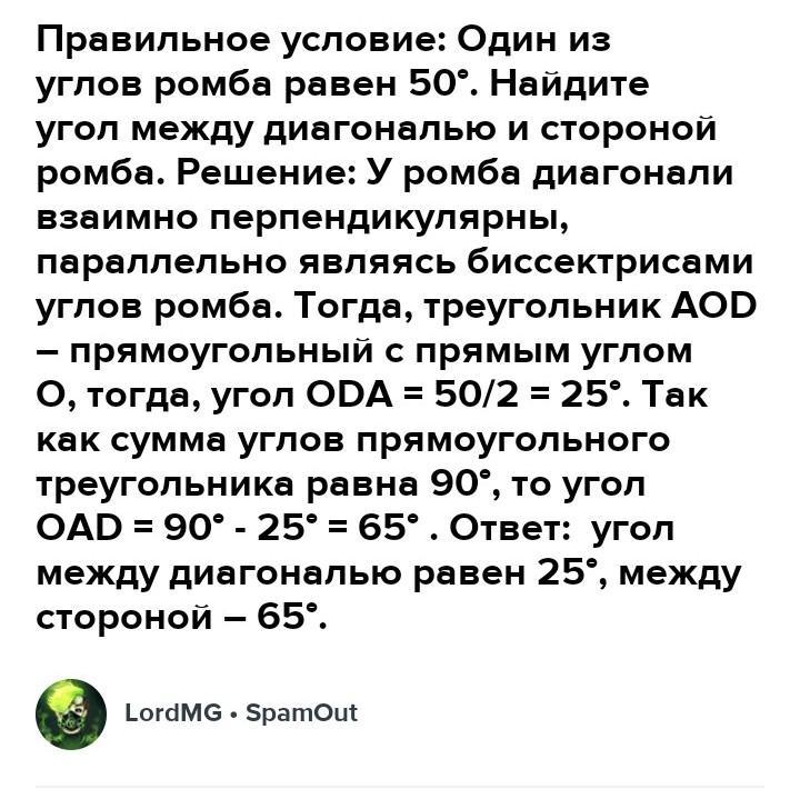 Правильное условие. Один из углов ромба равен 50°. Найдите угол между диагональю и стороной ромба. Решение на фотографии.