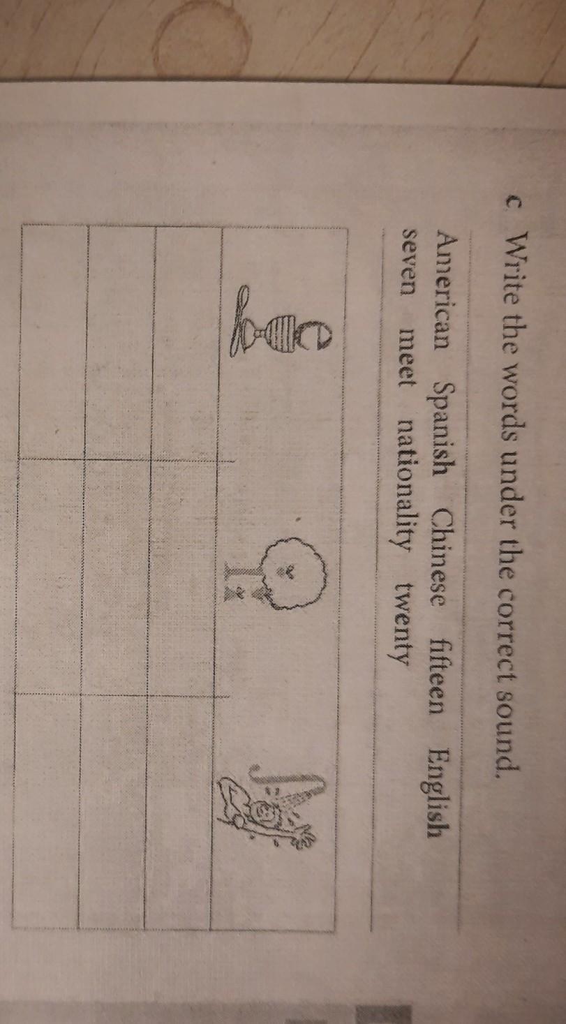 8 c Write the words under the correct sound. American Spanish Chinese fifteen English seven meet nationality twenty LI Oby 1 Cound Dan