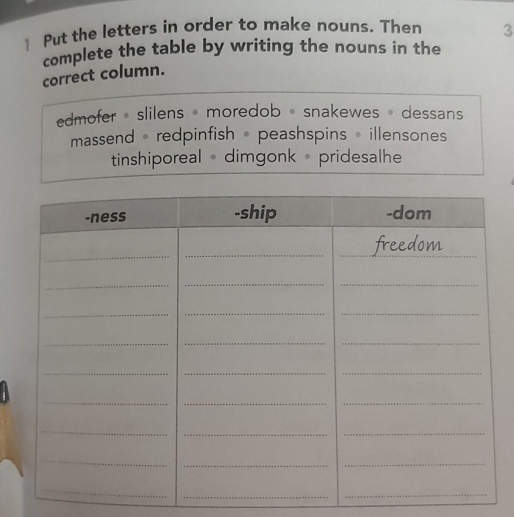 1 Put the letters in order to make nouns. Then complete the table by writing the nouns in the correct column. pacie.slilensmorecob Snacenes. cessans massend. redoinfish . peashsoins lensones tinshiporeal dimgonk. pridesaine