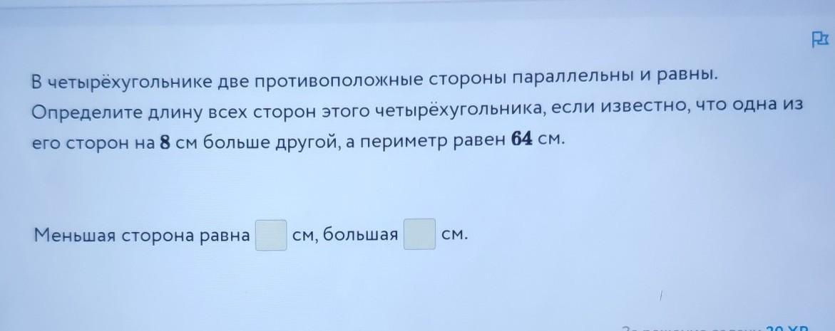 В четырехугольнике две противоположные стороны параллельны и равны определите длину всех сторон этого четырёхугольника, если известно, что одна из его сторон на 8 см больше другой а периметр равен 64 см меньшая сторона равна см большая см