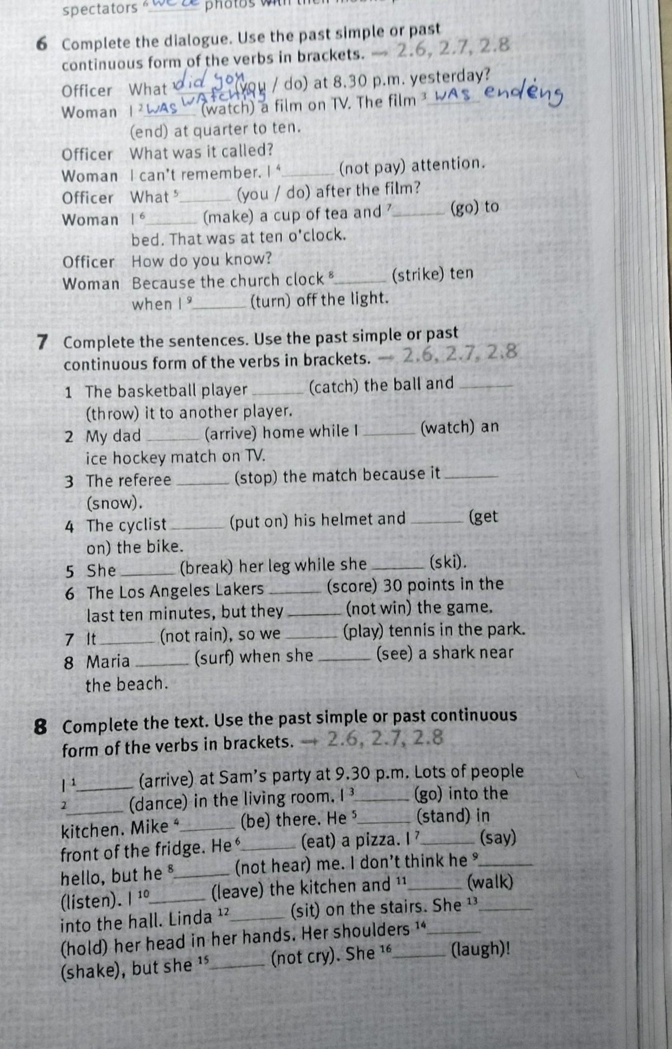 I *arrived* at Sam's party at 9.30 p.m. Lots of people *were dancing* in the living room. I *went* into the kitchen. Mike *was* there. He *was standing* in front of the fridge. He *was eating* a pizza. I said hello, but he *didn't hear* me. I don't think he *had listened.* I *left* the kitchen and *walked* into the hall. Linda *was sitting* on the stairs. She *was holding* her hands. Her shoulders were shaking, but she *wasn't crying.* She *was laughing!*