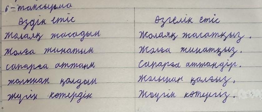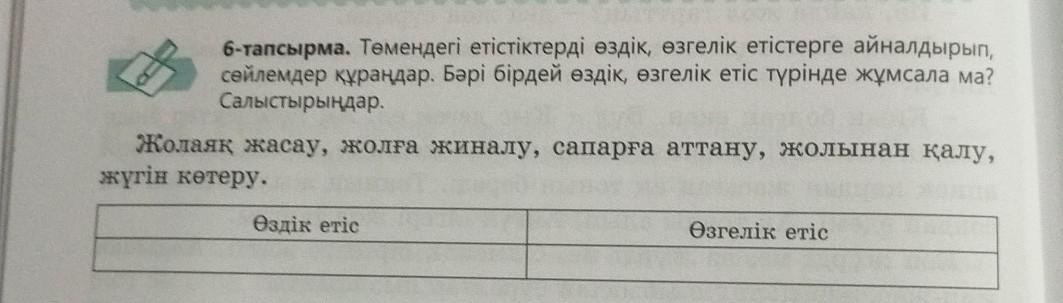 6-тапсырма. Төмендегі етістіктерді өздік, өзгелік етістерге айналдырып сөйлемдер құраңдар. Бәрі бірдей өздік, өзгелік етіс түрінде жұмсала ма? Салыстырыңдар.