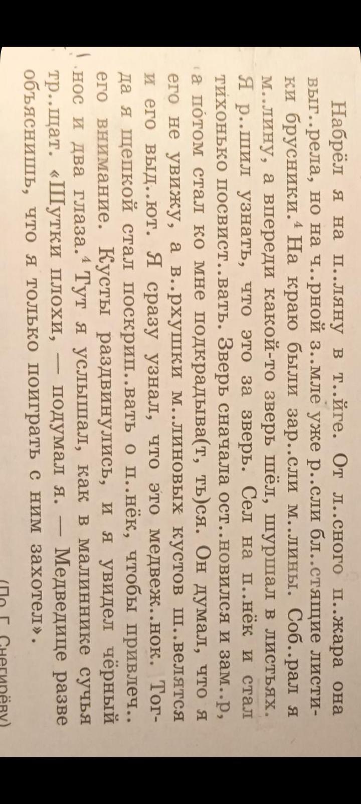 Ответ:От лесного пожара она выгорела,но на чёрной земле уже росли блестящие листики брусники(основа: она(сущ.) выгорела(гл.),росли(гл.) листики(сущ.)).Собрал я малину, а впереди какой-то зверь шел,шуршал в листьях(я(сущ.)собрал(гл.),зверь(сущ.)шел(гл.)).Он думал,что я его не увижу,а верхушки малиновых кустов шевелятся и его выдают(он(сущ.) думал(гл.),верхушки(сущ.)шевелятся(гл.)выдают(гл.)).Кусты раздвинулись,и я увидел чёрный нос и два глаза(кусты(сущ.) раздвинулись(гл.),я(сущ.)увидел(гл.)).Тут я услышал,как в малиннике сучья трещат(я(сущ.)услышал(гл.),сучья(сущ.)трещат(гл.)).
