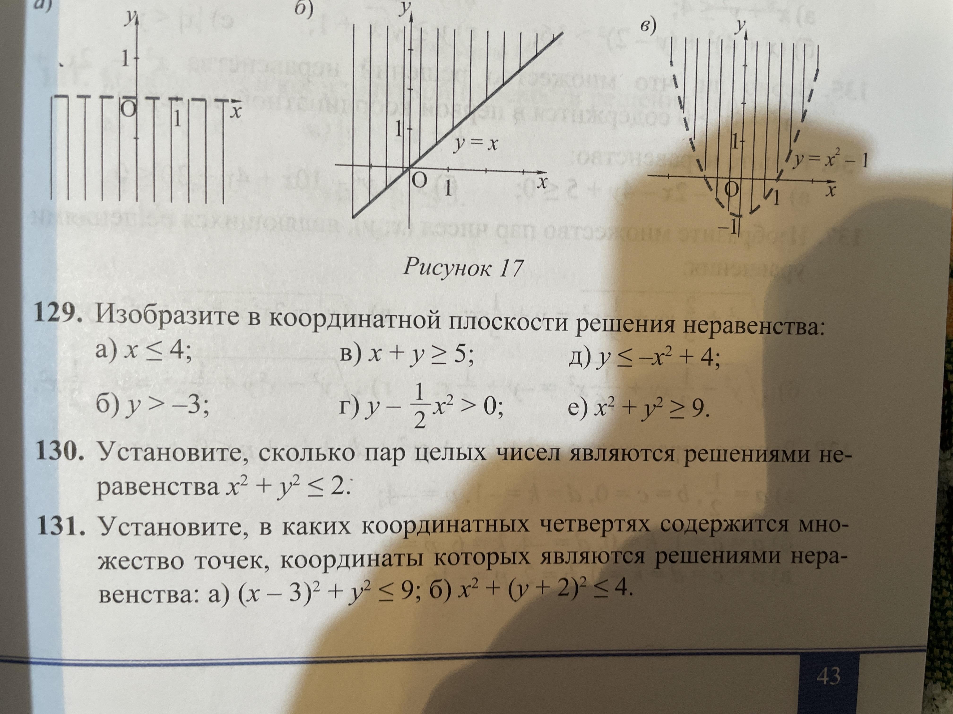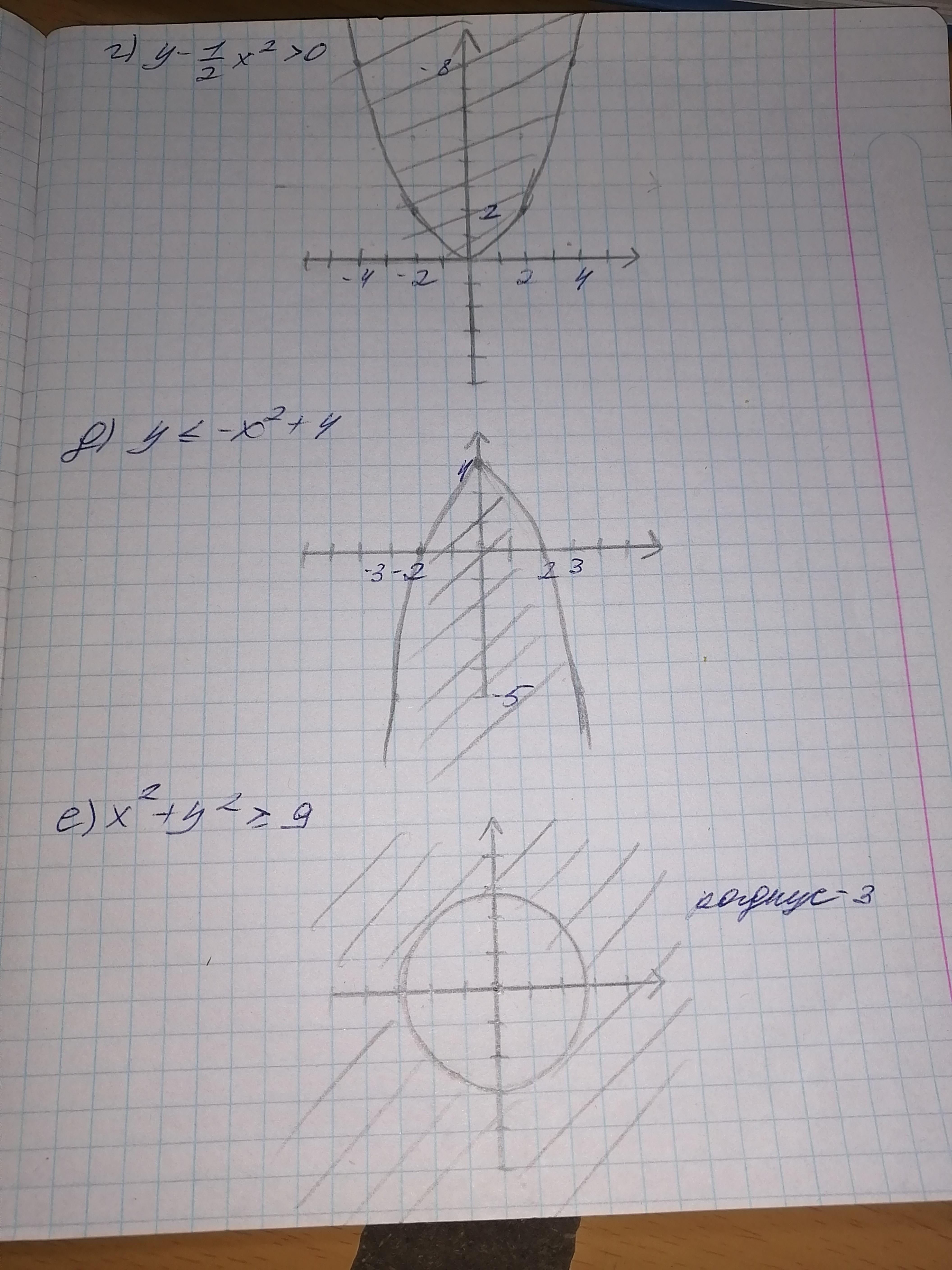 б)у>-3; в) х+у_>5; г) у - 1/2х^2>0; д) у_<-х^2+4; е) х^2+у^2_>9
