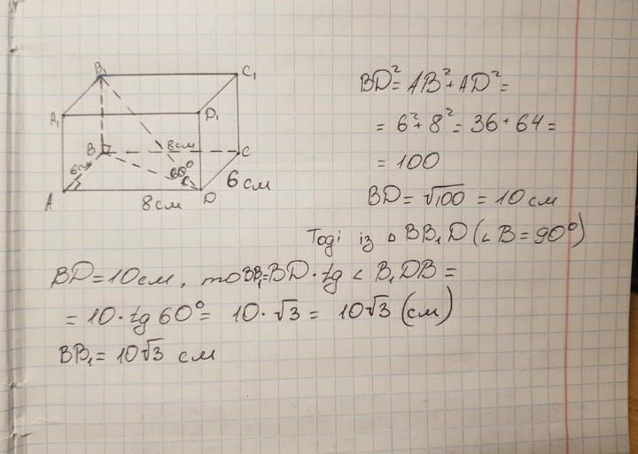 під яким кутом до площини основи нахилена діагональ прямокутного паралелепіпеда зі сторонами основи завдовжки 6 см і 8 см та бічними ребром 10 корінь з 3?