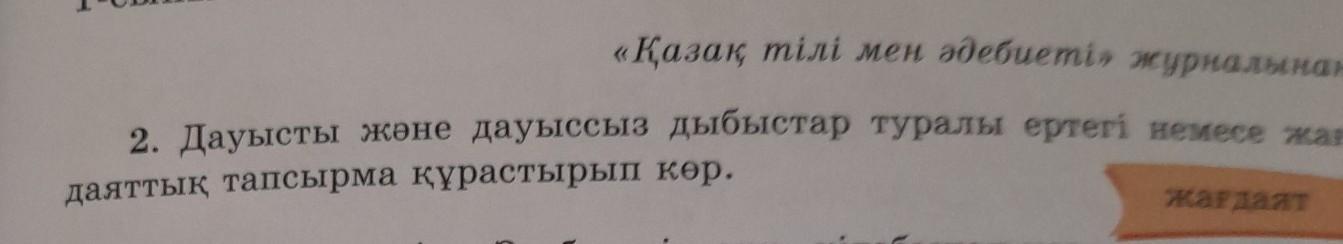 Ертеде екі жау ел болыпты,бір бірлерін көрсе ала көзбен қарап,соғысуға дайын тұрыпты.Бірінші елдің аты дауыстылар,екінші елдің аты дауыссыздар болыпты.Олар таққа таласыпты.Бір күні тағы соғыс болғанда екі елде жеңбепті.Əріптер патшасы келіп оларға ұрысыпты,оларға егер дауысты да дауыссыз да болмаса əріптер құралмас еді,сөздің қалпы келмес еді дейді.Дауысты жəне дауыссыз елді əріптер патшасы табыстырады,осылай олар ақылға келіп,жауласпай,тыныш өмір сүріпті.