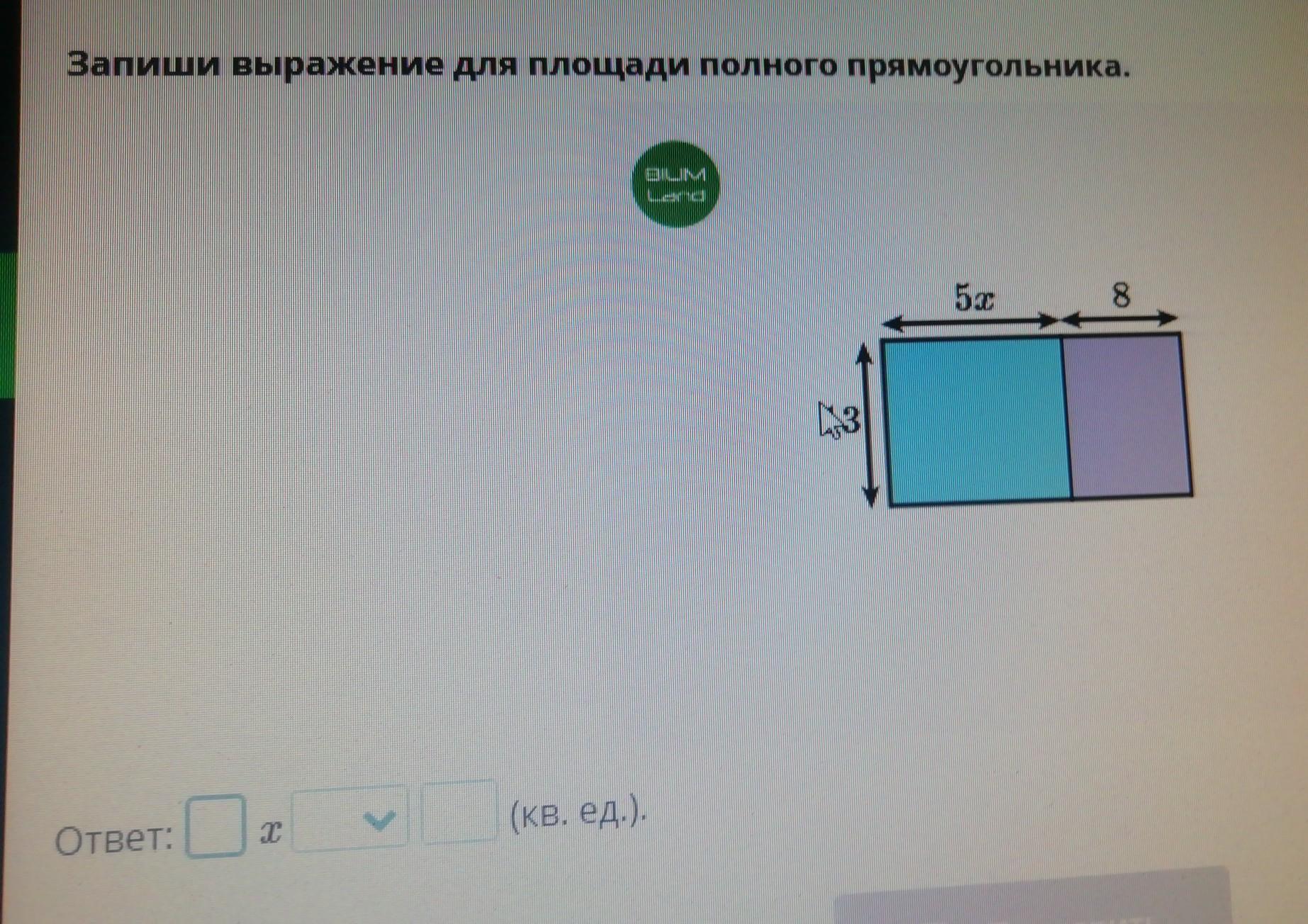 Числовые и буквенные выражения и их значения. Упрощение 3 Запиши выражение для площади полного прямоугольника. 5х 8 13 Ответ: (кв. ед.).