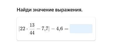 |22×13/44 - 7,7|-4,6 = |22/1 × 13/44 - 7,7| - 4,6 = |13/2 - 7,7| - 4,6 = | 6,5 - 7,7 | - 4,6 = |-1,2| - 4,6 = 1,2 - 4,6 = -3,4