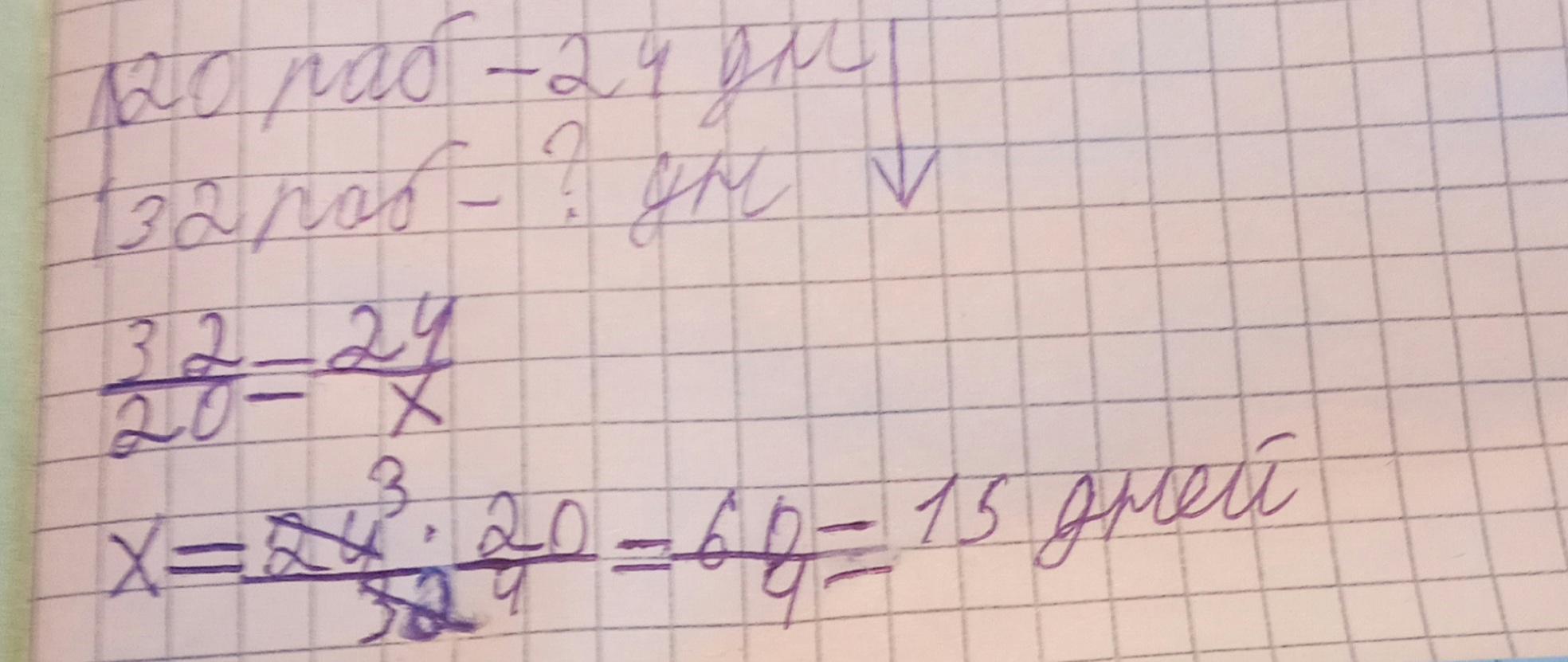 20 рабочих закончили отделку квартиры за 24 дня. За сколько дней выполнили бы эту работу 32 рабочих, работая с такой же производительностью?