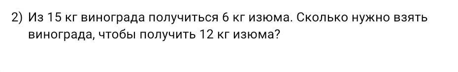 Из 15кг винограда получиться 6кг изюма.Сколько нужно взять винограда, чтобы получить 12кг изюма? Помогите ПОЖАЛУЙСТА
