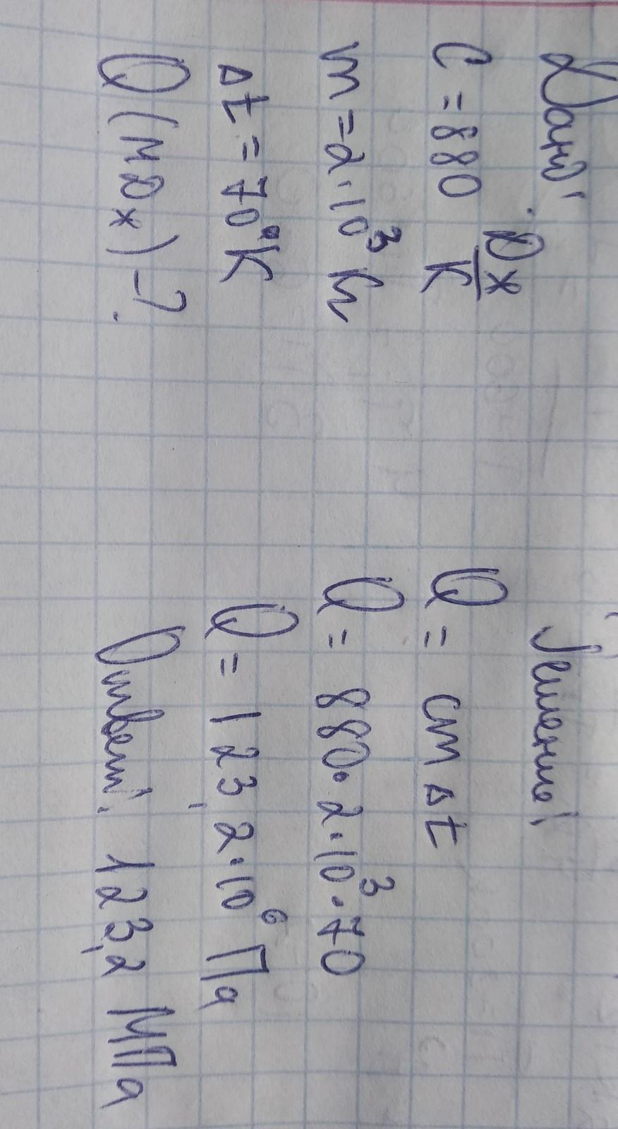 Яку кількість теплоти отримала цегляна піч масою 2 т, якщо вона нагрілась від 20с до 90с ? Питому теплоємність цегли вважати рівною 880 дж на кг на К!!!!!!!!