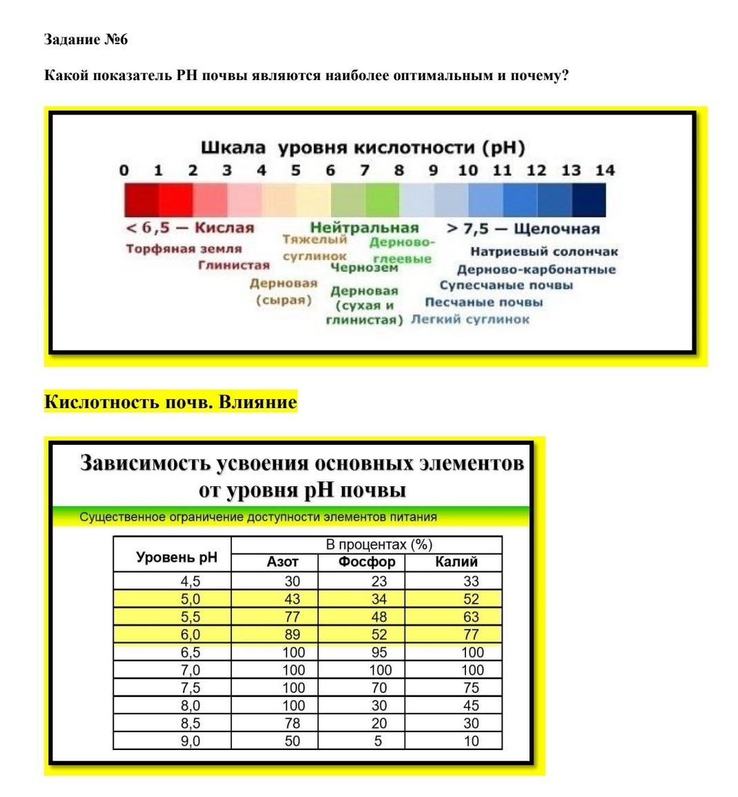 Объяснение: рН почвы это уровень концентрации ионов водорода в почвенном растворе. Чем ниже рН почвы, тем выше кислотность. В идеале рН должен поддерживаться на уровне выше 5,5 в верхнем слое почвы и 4,8 в недрах. В целом же рН измеряется по логарифмической шкале от 1 до 14, при этом 7 является нейтральным уровнем.