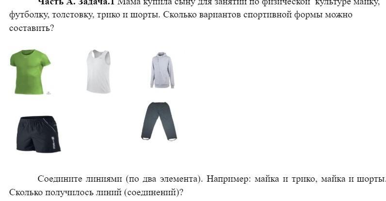 Мама купила сыну для занятий по физической культуре майку, футболку, толстовку, трико и шорты. Сколько вариантов спортивной формы можно составить? Соедините линиями (по два элемента). Например: майка и трико, майка и шорты. Сколько получилось линий (соединений)?