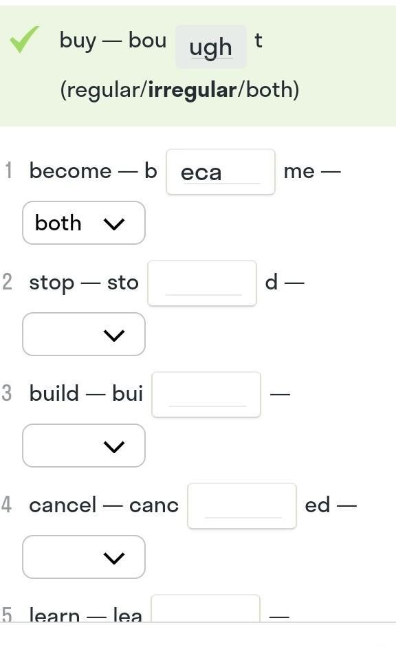 Ответ:became stopped ,cancelled ,built, learnt or learned