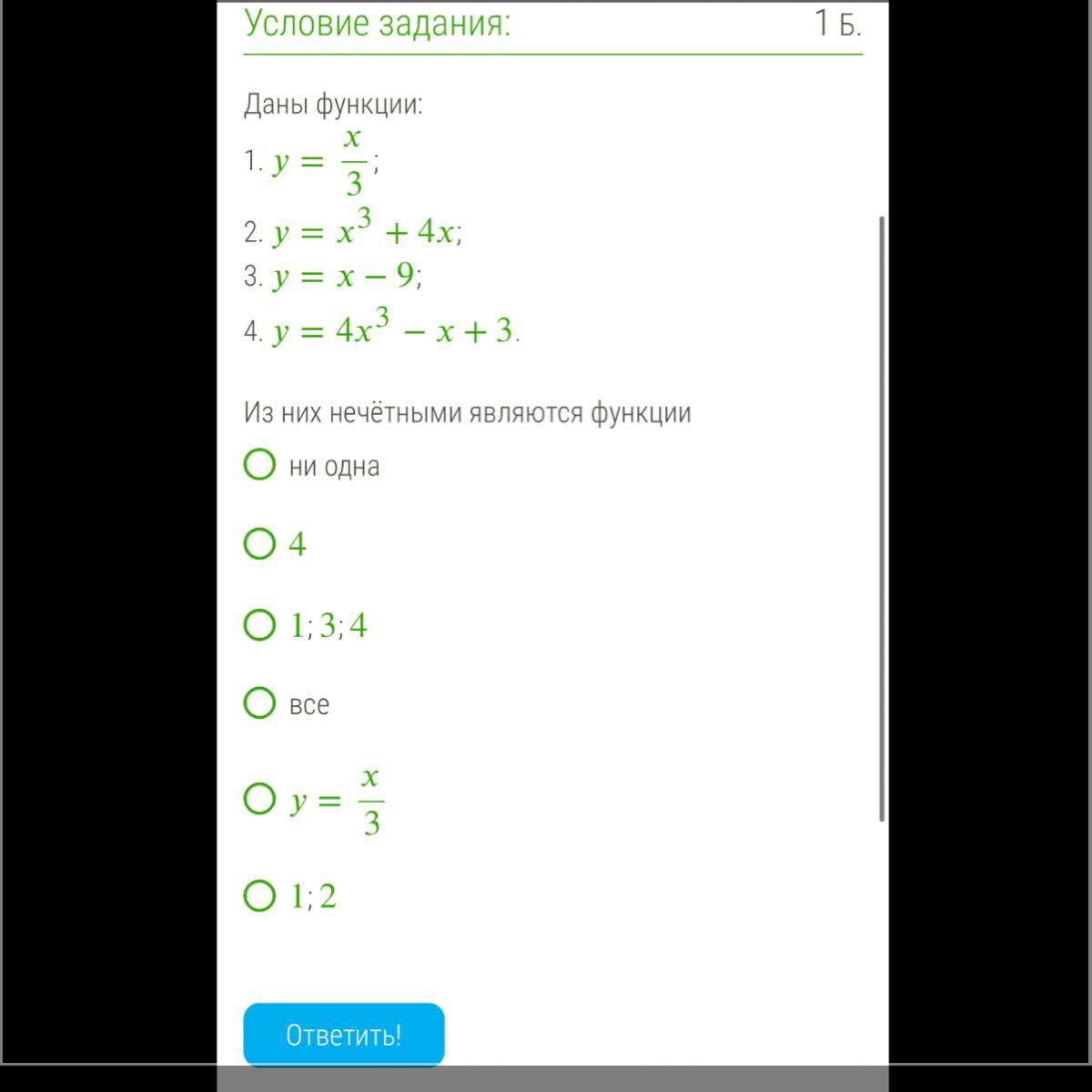 y(-x) = -x/3 = -y(x) ⇒ функция нечётная